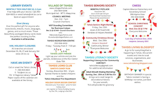 Just a reminder that the Tahsis Library is open regular hours/days this week, but won't re-open until Saturday, December 28th. If you have holds on the shelf, or would like to stock up on books or DVDs before the holidays, please stop in.